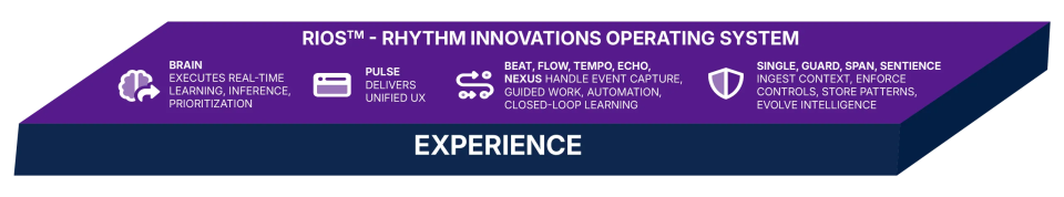 At the application tier sits the Rhythm Innovations Operating System™ (RIOS™), an eleven-layer intelligence framework that standardizes safety work across roles while remaining configurable to each customer’s workflows.