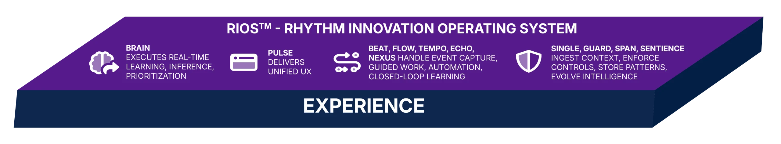 At the application tier sits the Rhythm Innovations Operating System™ (RIOS™), an eleven-layer intelligence framework that standardizes safety work across roles while remaining configurable to each customer’s workflows.